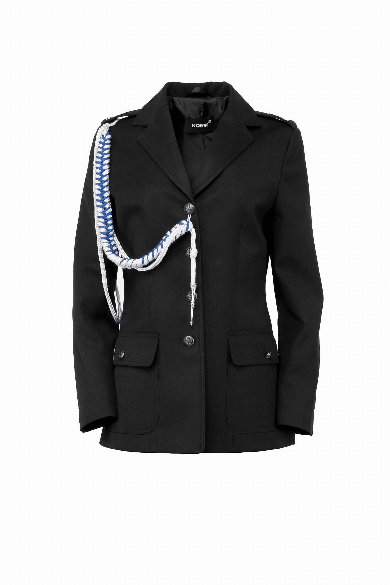 Marynarka do munduru strażackiego damskiego z czarnej gabardyny z pagonami oraz ognikami. Skład: 22% wełna owcza 25% wiskoza 53% poliester. Podszewka wiskozowa.
